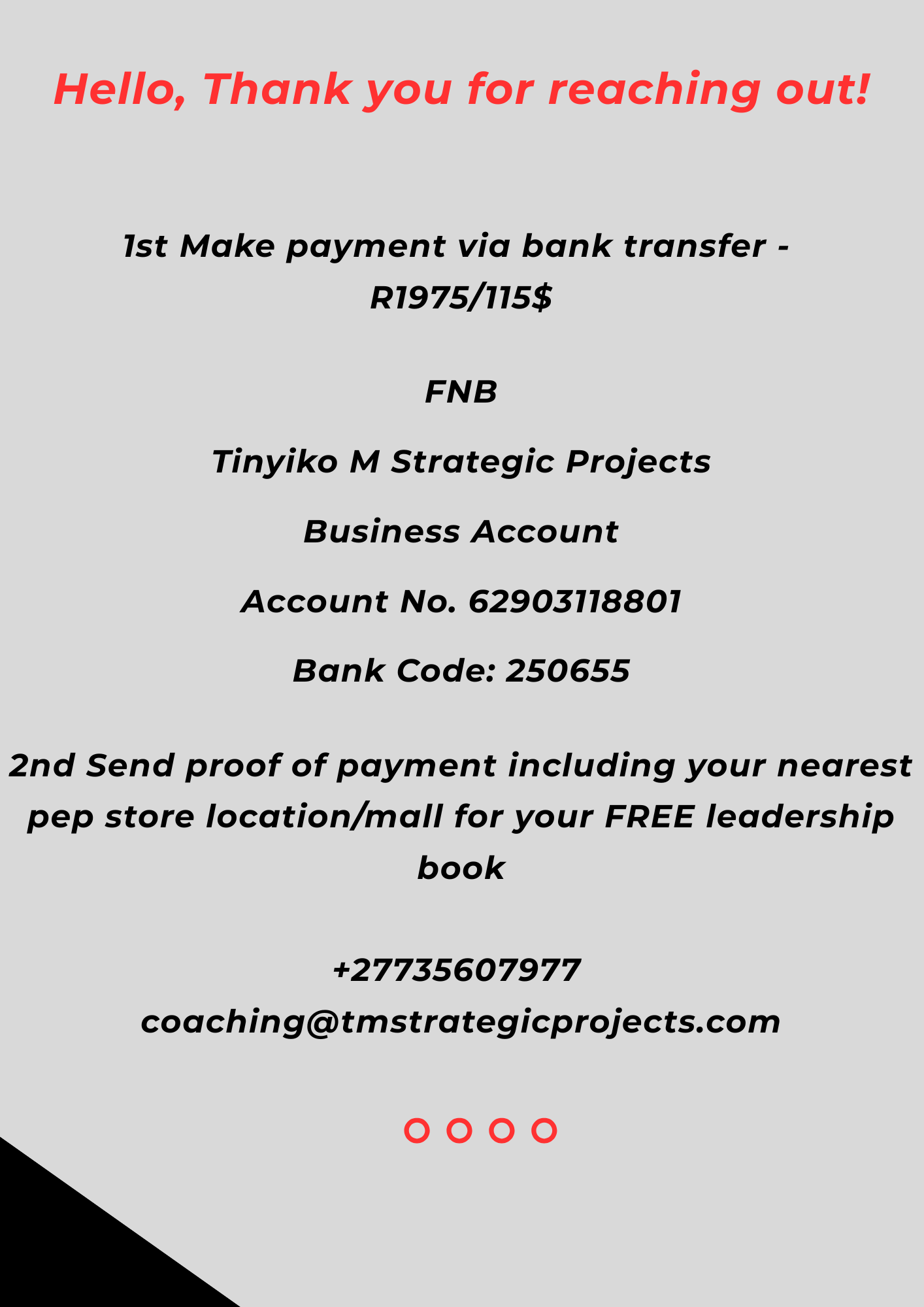 Send Proof of Payment, including your nearest pep store location/Mall for hard copy collection via email to coaching@tmstrategicprojects.com or WhatsApp (+27) 73 560 7977, Then look out for couriers’ SMS’s