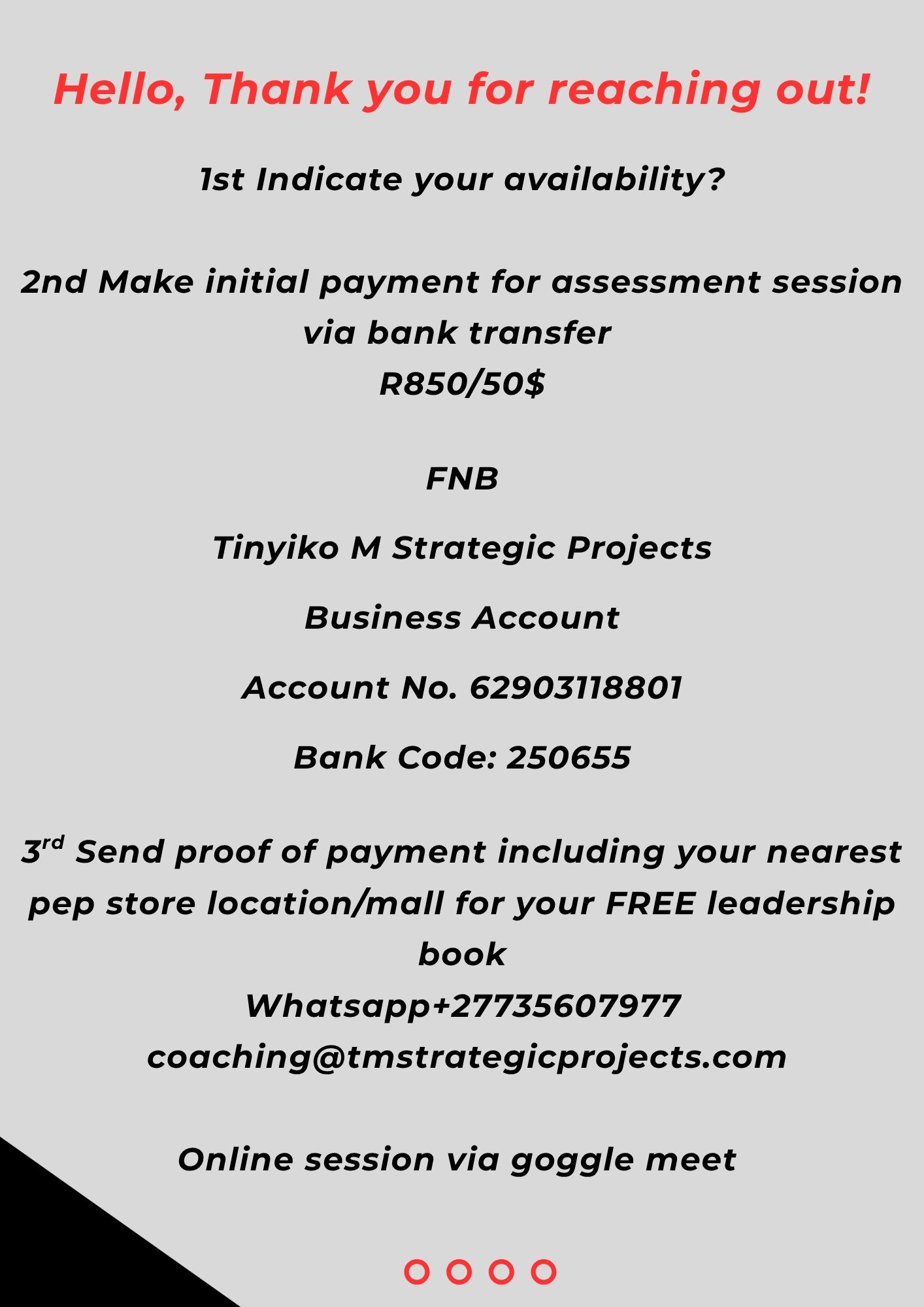 Please note: The consultation/diagnosis/needs assessment session to be conducted before the mentoring session can commence – valued at R2850/$170 (get a free leadership book when you sign up)